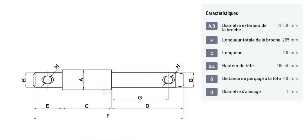 𝐀,𝐃 : 𝐃𝐢𝐚𝐦𝐞̀𝐭𝐫𝐞 𝐞𝐱𝐭𝐞́𝐫𝐢𝐞𝐮𝐫 𝐝𝐞 𝐥𝐚 𝐛𝐫𝐨𝐜𝐡𝐞 : 28 mm - 36 mm 𝐂𝐚𝐭𝐞́𝐠𝐨𝐫𝐢𝐞 : 2 - 3 𝐅 : 𝐋𝐨𝐧𝐠𝐮𝐞𝐮𝐫 𝐭𝐨𝐭𝐚𝐥𝐞 𝐝𝐞 𝐥𝐚 𝐛𝐫𝐨𝐜𝐡𝐞 : 265 mm 𝐂 : 𝐋𝐨𝐧𝐠𝐮𝐞𝐮𝐫 : 100 mm 𝐃,𝐄 : 𝐇𝐚𝐮𝐭𝐞𝐮𝐫 𝐝𝐞 𝐭𝐞̂𝐭𝐞 : 115 mm - 50 mm 𝐆 : 𝐃𝐢𝐬𝐭𝐚𝐧𝐜𝐞 𝐝𝐞 𝐩𝐞𝐫𝐜̧𝐚𝐠𝐞 𝐚̀ 𝐥𝐚 𝐭𝐞̂𝐭𝐞 : 100 mm 𝐇 : 𝐃𝐢𝐚𝐦𝐞̀𝐭𝐫𝐞 𝐝'𝐚𝐥𝐞́𝐬𝐚𝐠𝐞 : 11 mm