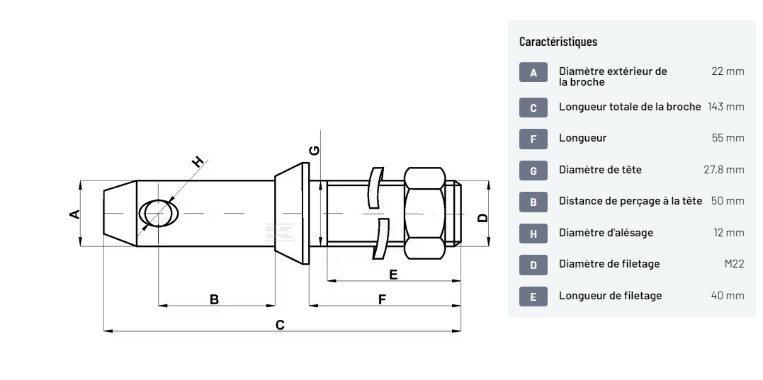 Axe de bras inférieur 22x143mm filetage: M22x40mm Cat.1