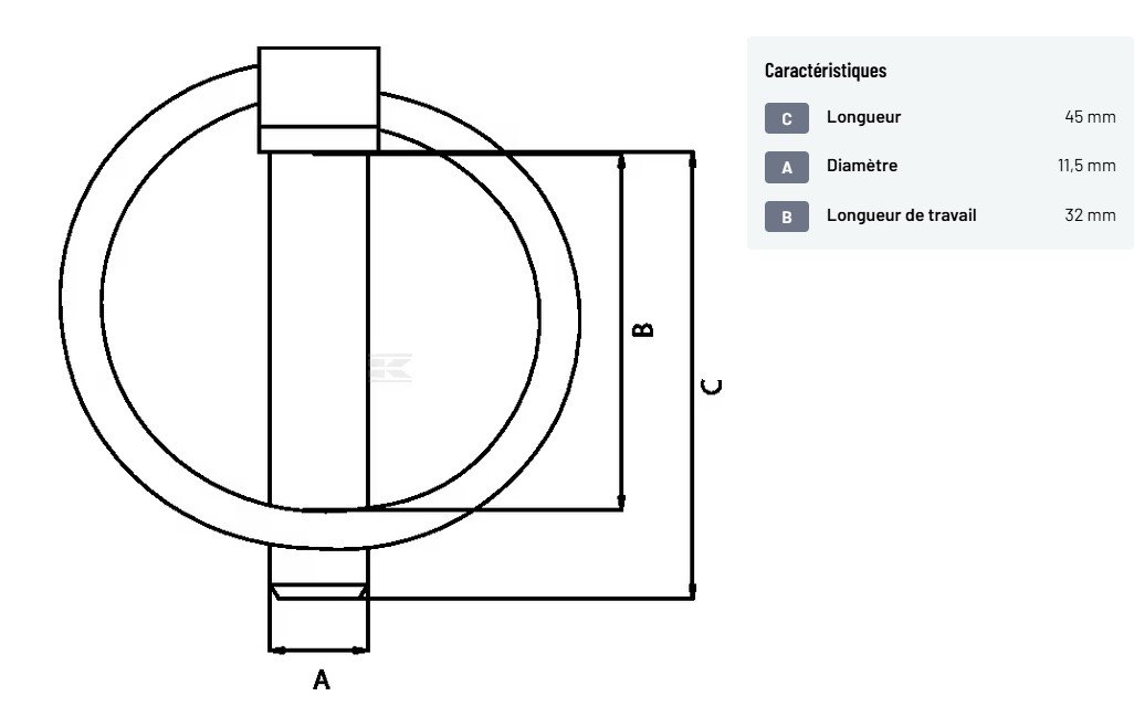 𝐂𝐚𝐫𝐚𝐜𝐭𝐞́𝐫𝐢𝐬𝐭𝐢𝐪𝐮𝐞𝐬 : - DIN 11023 - En acier traité CK 40 - Étrier de ressort en fil d'acier (DIN 17223) 𝐂 : 𝐋𝐨𝐧𝐠𝐮𝐞𝐮𝐫 : 45 mm 𝐀 : 𝐃𝐢𝐚𝐦𝐞̀𝐭𝐫𝐞 : 11.5 mm 𝐋𝐨𝐧𝐠𝐮𝐞𝐮𝐫 𝐭𝐨𝐭𝐚𝐥𝐞 : 66 mm 𝐁 : 𝐋𝐨𝐧𝐠𝐮𝐞𝐮𝐫 𝐝𝐞 𝐭𝐫𝐚𝐯𝐚𝐢𝐥 : 32 mm 𝐃𝐢𝐚𝐦𝐞̀𝐭𝐫𝐞 𝐝𝐞 𝐭𝐞̂𝐭𝐞 : 14 mm 𝐌𝐚𝐭𝐞́𝐫𝐢𝐚𝐮 : Acier 𝐓𝐫𝐚𝐢𝐭𝐞𝐦𝐞𝐧𝐭 𝐝𝐞 𝐬𝐮𝐫𝐟𝐚𝐜𝐞 : Zingué 𝐍𝐨𝐦𝐛𝐫𝐞 𝐝𝐞 𝐩𝐢𝐞̀𝐜𝐞 𝐝𝐚𝐧𝐬 𝐥'𝐞𝐦𝐛𝐚𝐥𝐥𝐚𝐠𝐞 𝐮𝐬𝐢𝐧𝐞 : 6