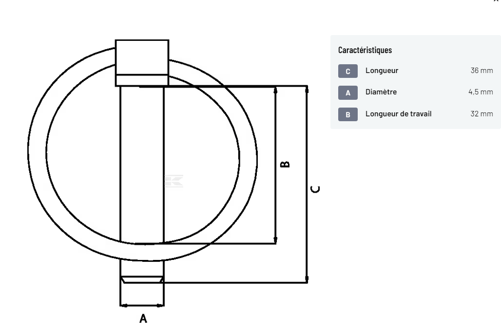 𝐂 : 𝐋𝐨𝐧𝐠𝐮𝐞𝐮𝐫 : 36 mm 𝐀 : 𝐃𝐢𝐚𝐦𝐞̀𝐭𝐫𝐞 : 4.5 mm 𝐋𝐨𝐧𝐠𝐮𝐞𝐮𝐫 𝐭𝐨𝐭𝐚𝐥𝐞 : 42.5 mm 𝐁 : 𝐋𝐨𝐧𝐠𝐮𝐞𝐮𝐫 𝐝𝐞 𝐭𝐫𝐚𝐯𝐚𝐢𝐥 : 32 mm 𝐃𝐢𝐚𝐦𝐞̀𝐭𝐫𝐞 𝐝𝐞 𝐭𝐞̂𝐭𝐞 : 8 mm 𝐌𝐚𝐭𝐞́𝐫𝐢𝐚𝐮 : Acier 𝐓𝐫𝐚𝐢𝐭𝐞𝐦𝐞𝐧𝐭 𝐝𝐞 𝐬𝐮𝐫𝐟𝐚𝐜𝐞 : Zingué 𝐍𝐨𝐦𝐛𝐫𝐞 𝐝𝐞 𝐩𝐢𝐞̀𝐜𝐞 𝐝𝐚𝐧𝐬 𝐥'𝐞𝐦𝐛𝐚𝐥𝐥𝐚𝐠𝐞 𝐮𝐬𝐢𝐧𝐞 : 6