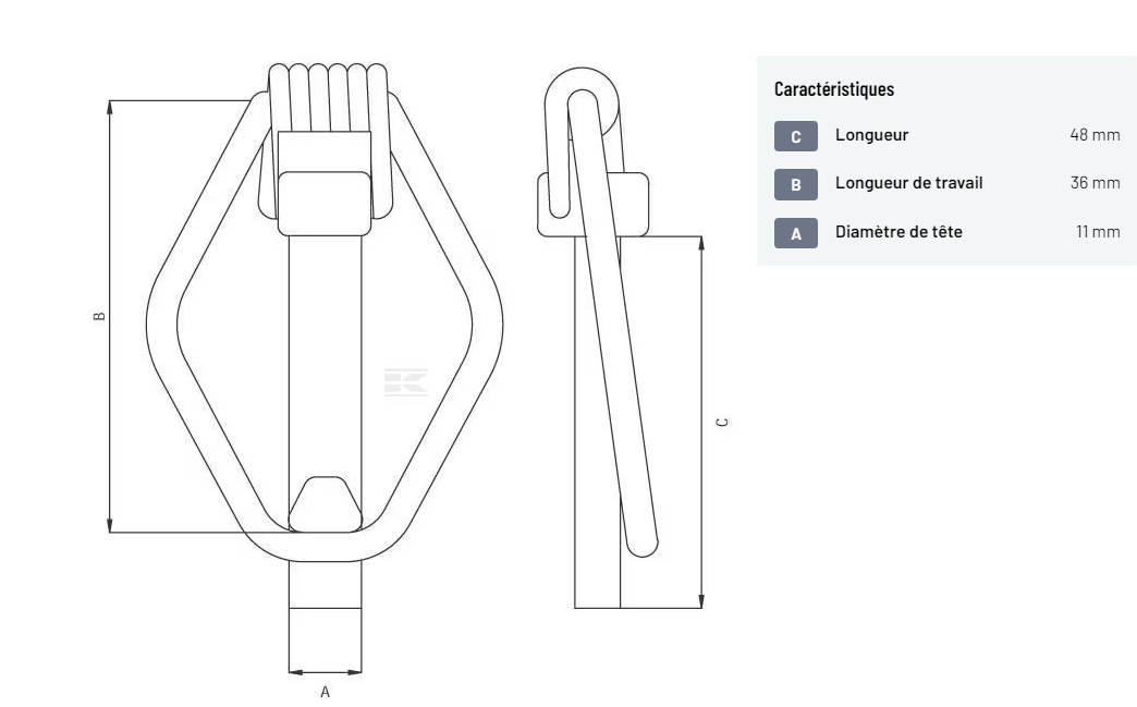 𝐂 : 𝐋𝐨𝐧𝐠𝐮𝐞𝐮𝐫 : 48 mm 𝐀 : 𝐃𝐢𝐚𝐦𝐞̀𝐭𝐫𝐞 : 8 mm 𝐋𝐨𝐧𝐠𝐮𝐞𝐮𝐫 𝐭𝐨𝐭𝐚𝐥𝐞 : 56 mm 𝐁 : 𝐋𝐨𝐧𝐠𝐮𝐞𝐮𝐫 𝐝𝐞 𝐭𝐫𝐚𝐯𝐚𝐢𝐥 : 36 mm 𝐃𝐢𝐚𝐦𝐞̀𝐭𝐫𝐞 𝐝𝐞 𝐭𝐞̂𝐭𝐞 : 11 mm 𝐌𝐚𝐭𝐞́𝐫𝐢𝐚𝐮 : Acier 𝐓𝐫𝐚𝐢𝐭𝐞𝐦𝐞𝐧𝐭 𝐝𝐞 𝐬𝐮𝐫𝐟𝐚𝐜𝐞 : Zingué 𝐍𝐨𝐦𝐛𝐫𝐞 𝐝𝐞 𝐩𝐢𝐞̀𝐜𝐞 𝐝𝐚𝐧𝐬 𝐥'𝐞𝐦𝐛𝐚𝐥𝐥𝐚𝐠𝐞 𝐮𝐬𝐢𝐧𝐞 : 6
