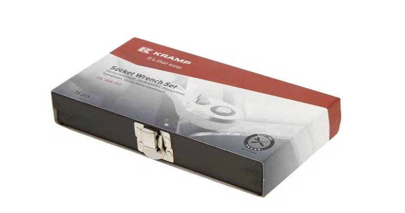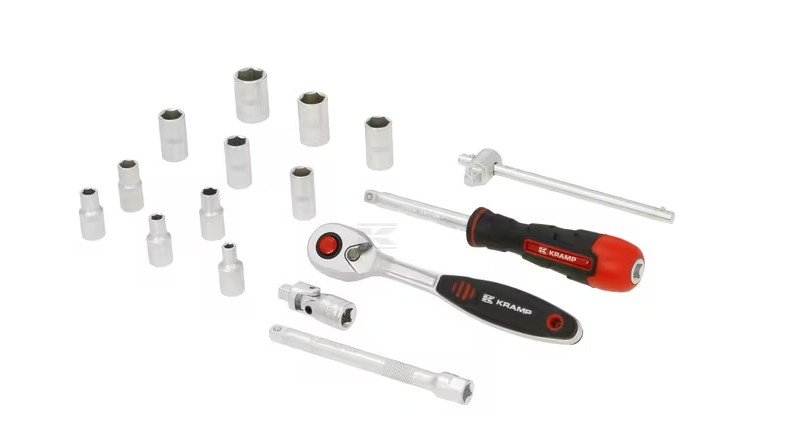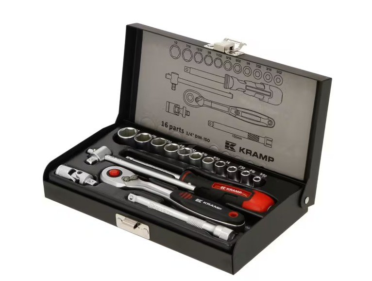 Ensemble de 16 douilles professionnelles, carré conducteur 1/4", avec cliquet à dents fines réversible, différentes tailles, en acier au chrome-vanadium. Rangées dans un coffret en métal durable, solide et bien organisé.