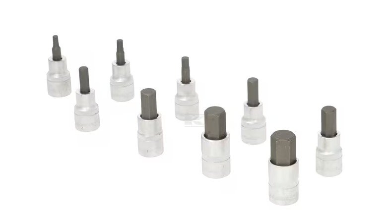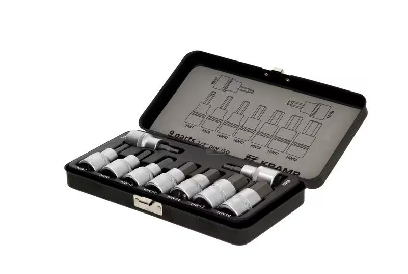 Ensemble de 9 douilles hexagonales pour vis à six pans creux, différentes tailles, en acier au chrome-vanadium. Rangées dans un coffret en métal durable, solide et bien organisé.
