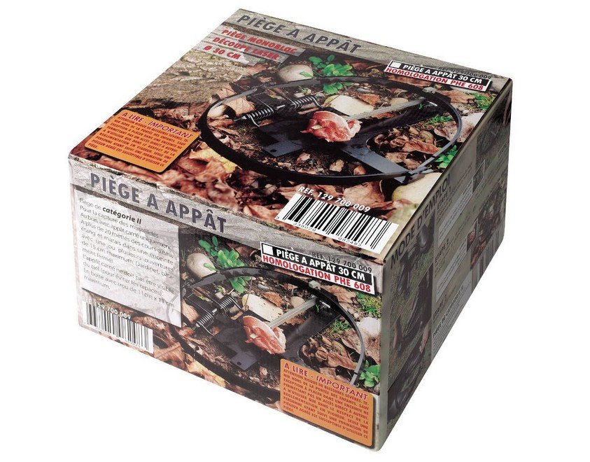 Piège à appât encore appelé kill trap de 30 cm de diamètre, idéal pour capturer facilement et rapidement renard et fouine. Il vous suffira de placer l’appât de votre choix dans le piège, de l’armer et d’attendre que le nuisible soit capturé. Fabrication robuste et peinture faite par cataphorèse pour limiter l’apparition de la rouille et réduire l’odeur humaine. Ce piège est idéal pour libérer votre grenier de la fouine ou encore protéger votre poulailler de renards ou de fouines. Ce piège s’arme très facilement et son efficacité vous surprendra. Avec le piège à appât, capturez facilement les nuisibles comme la fouine ou le renard !