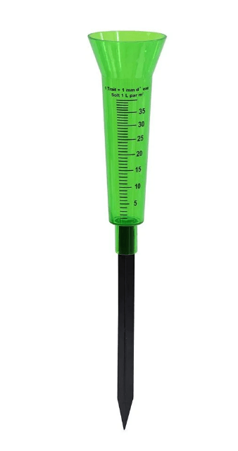 Pluviomètre manuel à lecture directe. Il permet de mesurer les précipitations à un endroit donné et ainsi ajuster la fréquence d'arrosage à l'aide de ses graduations. Facile à installer, son pied se plantera facilement dans le sol.