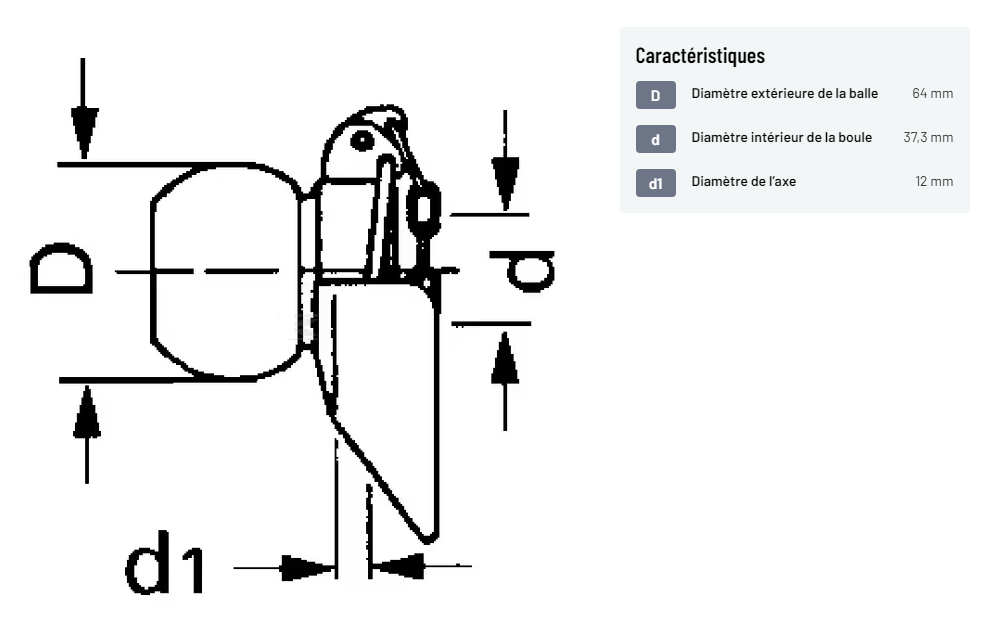 𝐂𝐚𝐭𝐞́𝐠𝐨𝐫𝐢𝐞 : 3 𝐃 : Diamètre extérieure de la balle : 64 mm 𝐝 : Diamètre intérieur de la boule : 37.3 mm 𝐝𝟏 : Diamètre de l’axe : 12 mm