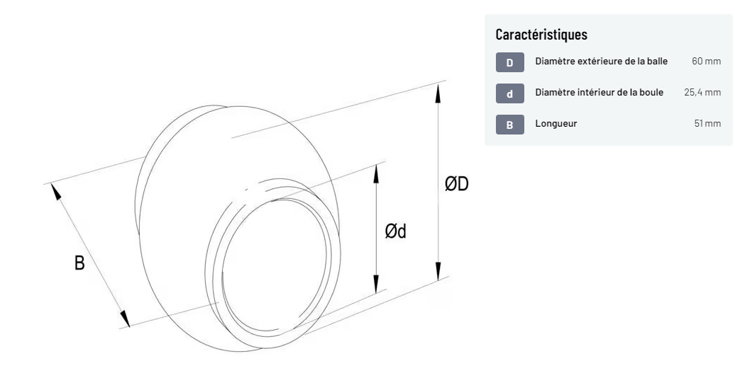 𝐂𝐚𝐭𝐞́𝐠𝐨𝐫𝐢𝐞 𝟑 - 2 𝐃 : Diamètre extérieure de la balle : 60 mm 𝐝 : Diamètre intérieur de la boule : 25. mm 𝐁 : Longueur : 51 mm