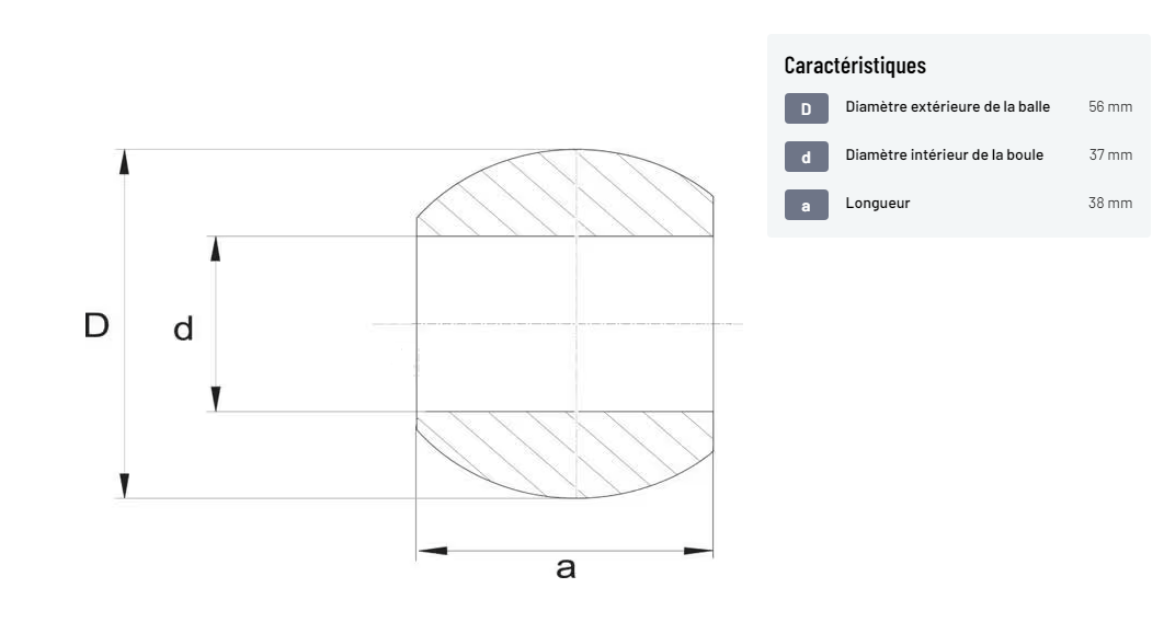 𝐂𝐚𝐭𝐞́𝐠𝐨𝐫𝐢𝐞 2 - 3 𝐃 : Diamètre extérieure de la balle : 56 mm 𝐝 : Diamètre intérieur de la boule : 37 mm 𝐚 : Longueur : 38 mm