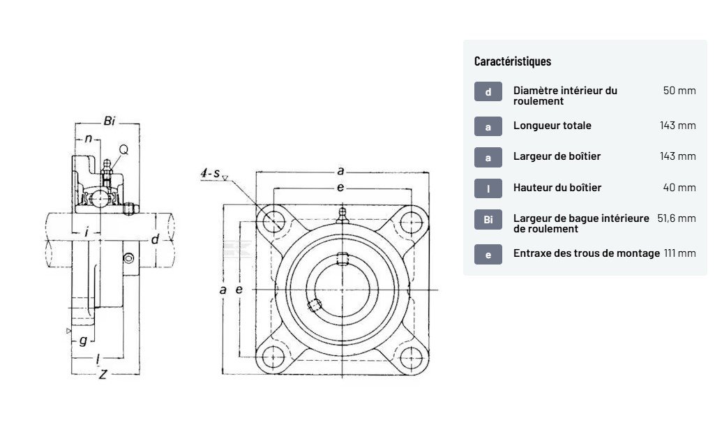 𝐃𝐞́𝐭𝐚𝐢𝐥𝐬 𝐝𝐮 𝐩𝐫𝐨𝐝𝐮𝐢𝐭 : Le roulement intérieur a une bague intérieure allongée des deux côtés avec 2 vis de réglage Graissable Roulement à billes à alignement automatique Roulement à billes à large bague intérieure 𝐂𝐨𝐦𝐩𝐫𝐞𝐧𝐝 : Paliers de roulements Roulement Graisseur 𝐓𝐲𝐩𝐞 𝐝𝐞 𝐛𝐨𝐢̂𝐭𝐢𝐞𝐫 : Bride carrée 𝐝 : 𝐃𝐢𝐚𝐦𝐞̀𝐭𝐫𝐞 𝐢𝐧𝐭𝐞́𝐫𝐢𝐞𝐮𝐫 𝐝𝐮 𝐫𝐨𝐮𝐥𝐞𝐦𝐞𝐧𝐭 : 50 mm 𝐚 : 𝐋𝐨𝐧𝐠𝐮𝐞𝐮𝐫 𝐭𝐨𝐭𝐚𝐥𝐞 : 143 mm 𝐚 : 𝐋𝐚𝐫𝐠𝐞𝐮𝐫 𝐝𝐞 𝐛𝐨𝐢̂𝐭𝐢𝐞𝐫 : 143 mm 𝐇𝐚𝐮𝐭𝐞𝐮𝐫 𝐭𝐨𝐭𝐚𝐥𝐞 : 54,6 mm 𝐥 : 𝐇𝐚𝐮𝐭𝐞𝐮𝐫 𝐝𝐮 𝐛𝐨𝐢̂𝐭𝐢𝐞𝐫 : 40 mm 𝐁𝐢 : 𝐋𝐚𝐫𝐠𝐞𝐮𝐫 𝐝𝐞 𝐛𝐚𝐠𝐮𝐞 𝐢𝐧𝐭𝐞́𝐫𝐢𝐞𝐮𝐫𝐞 𝐝𝐞 𝐫𝐨𝐮𝐥𝐞𝐦𝐞𝐧𝐭 : 51,6 mm 𝐃𝐢𝐬𝐭𝐚𝐧𝐜𝐞 𝐛𝐢𝐥𝐥𝐞𝐬 𝐝𝐞 𝐫𝐨𝐮𝐥𝐞𝐦𝐞𝐧𝐭 𝐚̀ 𝐞𝐱𝐭𝐫𝐞́𝐦𝐢𝐭𝐞́ 𝐜𝐨̂𝐭𝐞́ 𝐯𝐞𝐫𝐫𝐨𝐮𝐢𝐥𝐥𝐚𝐠𝐞 : 22 mm 𝐞 : 𝐄𝐧𝐭𝐫𝐚𝐱𝐞 𝐝𝐞𝐬 𝐭𝐫𝐨𝐮𝐬 𝐝𝐞 𝐦𝐨𝐧𝐭𝐚𝐠𝐞 : 111 mm 𝐃𝐢𝐚𝐦𝐞̀𝐭𝐫𝐞 𝐝𝐞𝐬 𝐭𝐫𝐨𝐮𝐬 𝐝𝐞 𝐦𝐨𝐧𝐭𝐚𝐠𝐞 : 16 mm